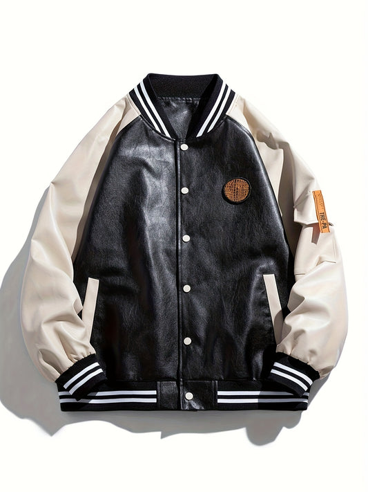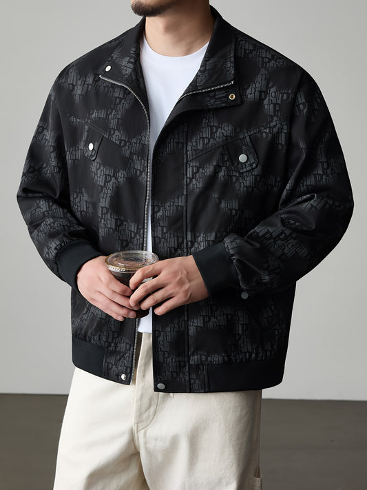 Men's Autumn Letter Print Bomber Jacket with Stand Collar & Zipper Closure