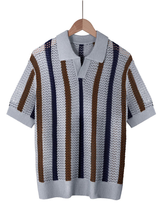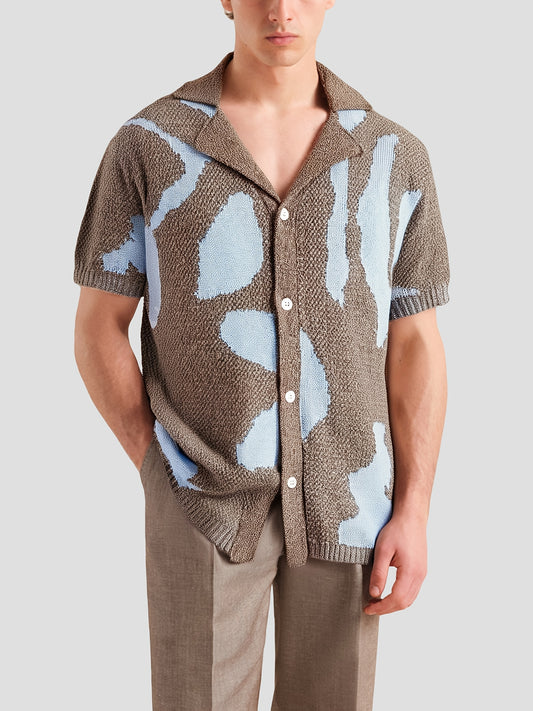 Men's Crochet Brown Floral Knit Casual Loose Fit Short Sleeve Knitted Shirt