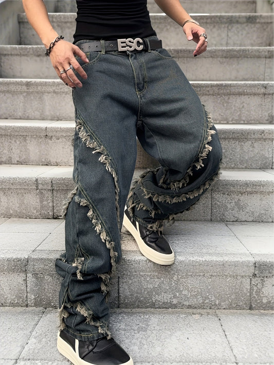 Men'S Street Style Denim Jeans with Frayed Hem