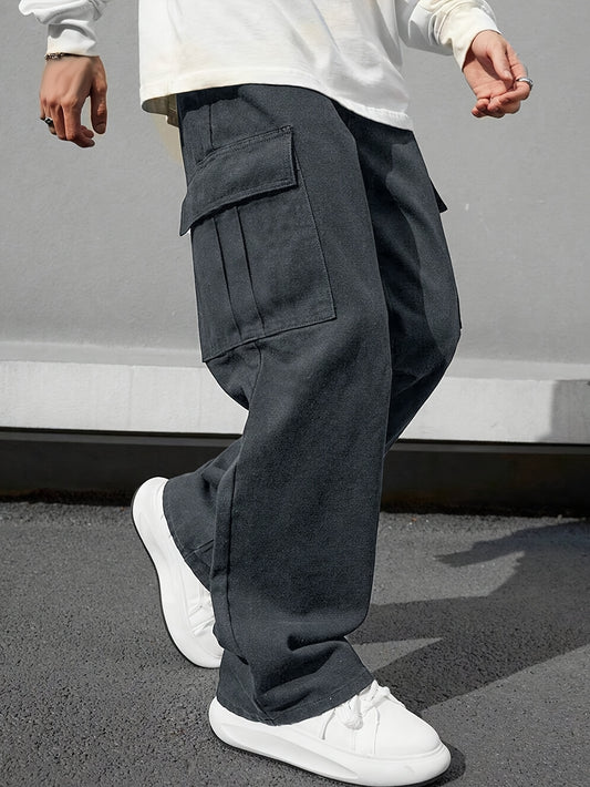 Solid Multi Flap Pockets Men's Straight Leg Cargo Pants