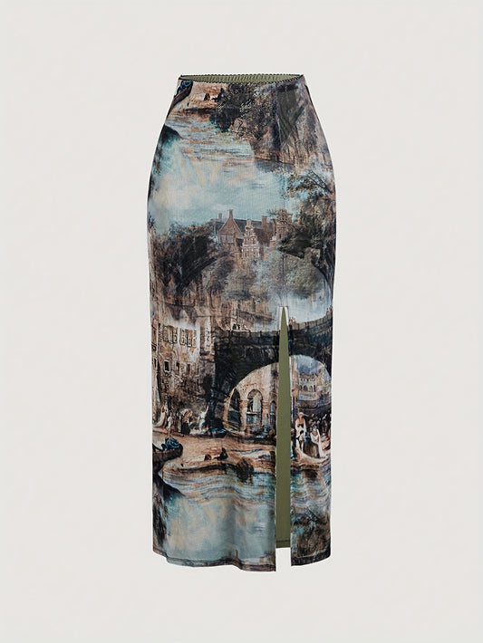 Women's Vintage Oil Painting Print Slim-Fit Skirt