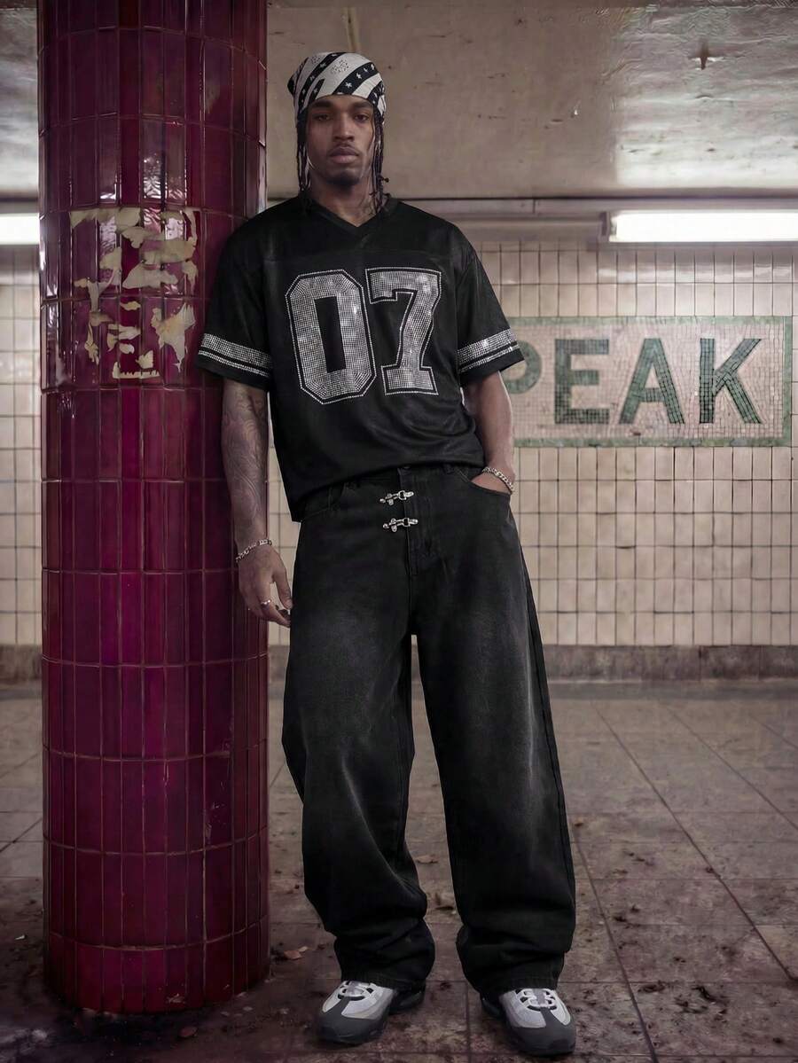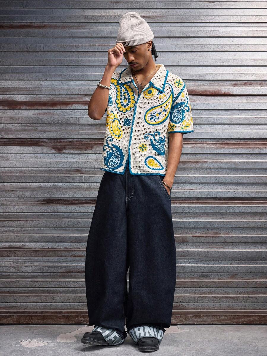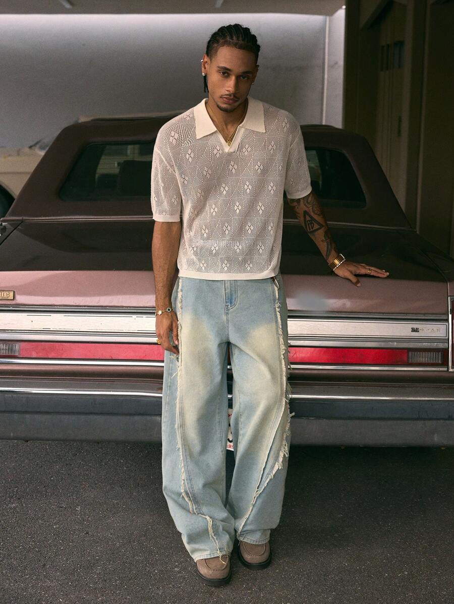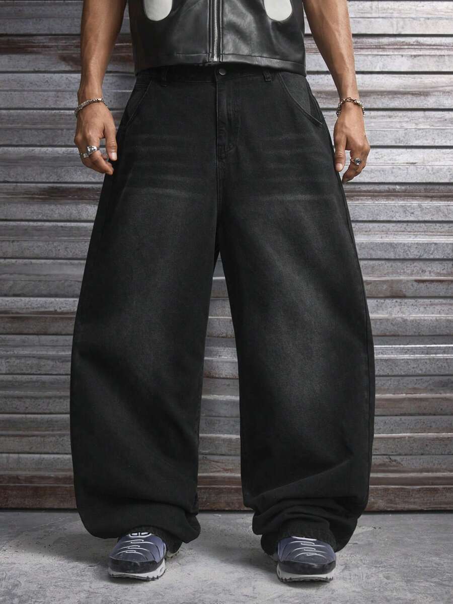 Fashionable Straight Loose Fit Patchwork Frayed Hem Men's Baggy Denim Jeans, Streetwear Style