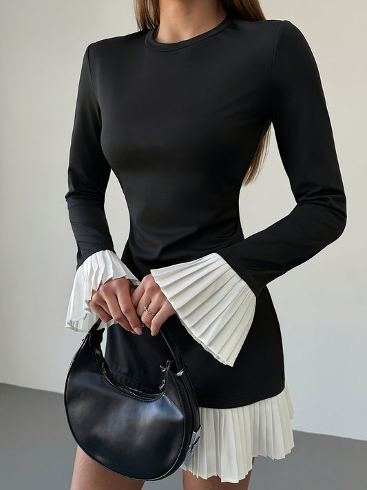 Women's Elegant A-Line Dress with Long Ruffled Sleeves & Pleated Hem
