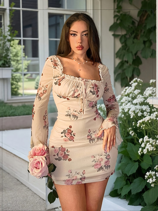 Women'S Floral Print Backless Mini Dress with Bell Sleeves